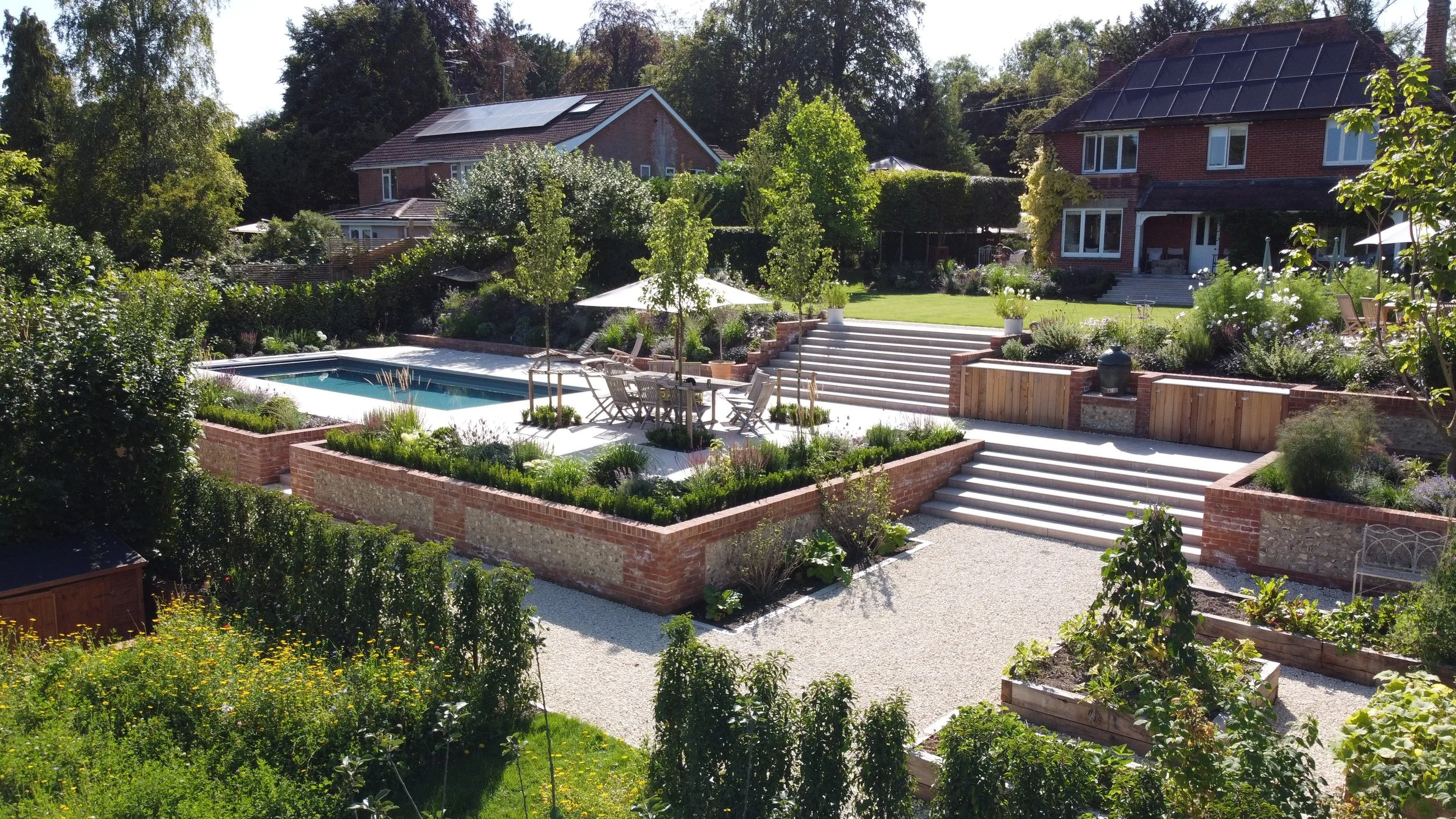 An extensive landscaping project, transforming a sloped grassy bank into a series functional terraces, including the introduction of a new swimming pool.