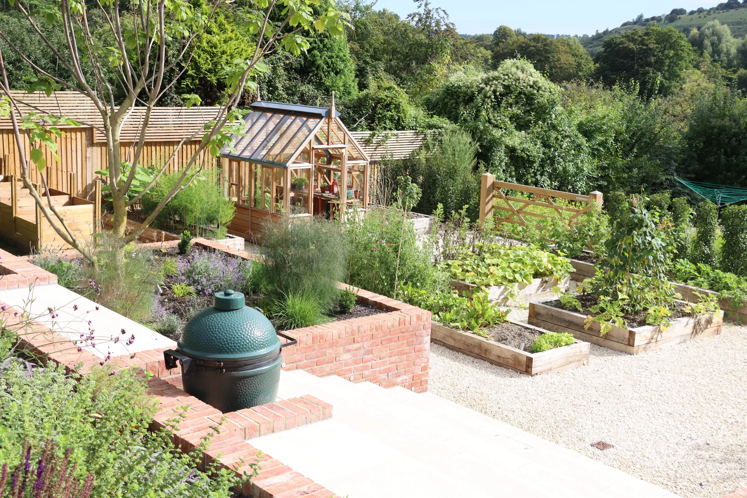 Brick and flint retaining walls defining key spaces within the garden, with spaces for outdoor dining and entertaining, growing vegetables and children’s play.